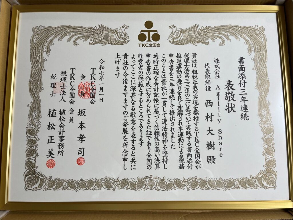 このたび、TKC全国会様より適切な会計処理が認められ、表敬状をいただきました。